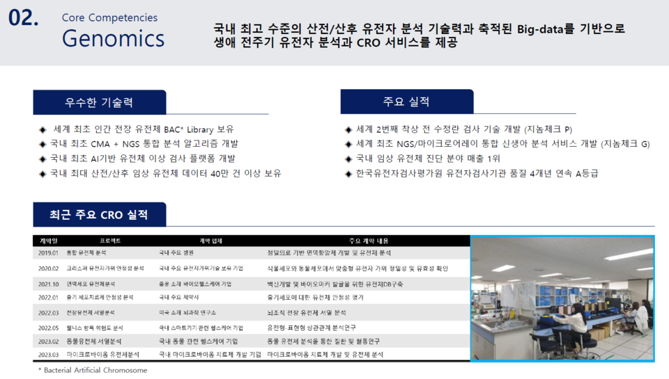 The company provides total healthcare solutions for disease diagnosis, treatment, prevention, and management based on its excellent diagnostic technology and microbiome R&D capacity. In particular, the company provides big data-based genetic analysis services for the entire life cycle.